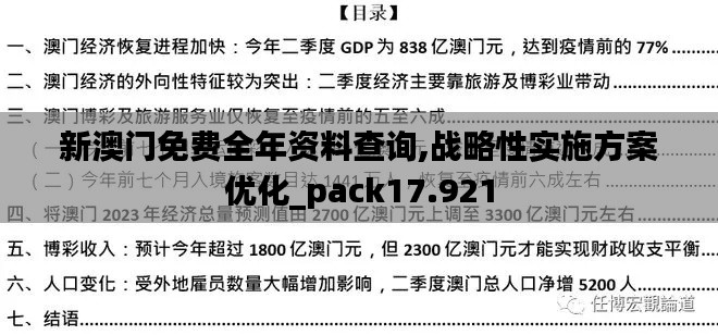 新澳门免费全年资料查询,战略性实施方案优化_pack17.921是一项重要的政策文件,旨在通过提供全面的资料查询服务,促进澳门地区的经济发展和社会进步。在当前全球经济一体化和数字化的背景下,信息资源的重要性日益凸显。为了更好地支持澳门地区的企业和个人,政策文件强调提供免费的全年资料查询服务,为各个领域的决策提供有力的数据支持。